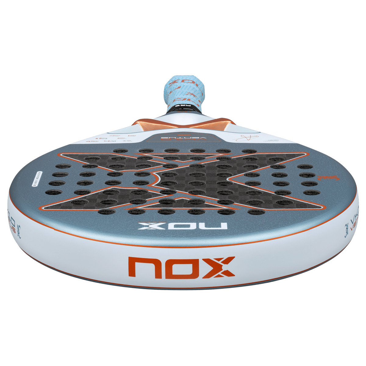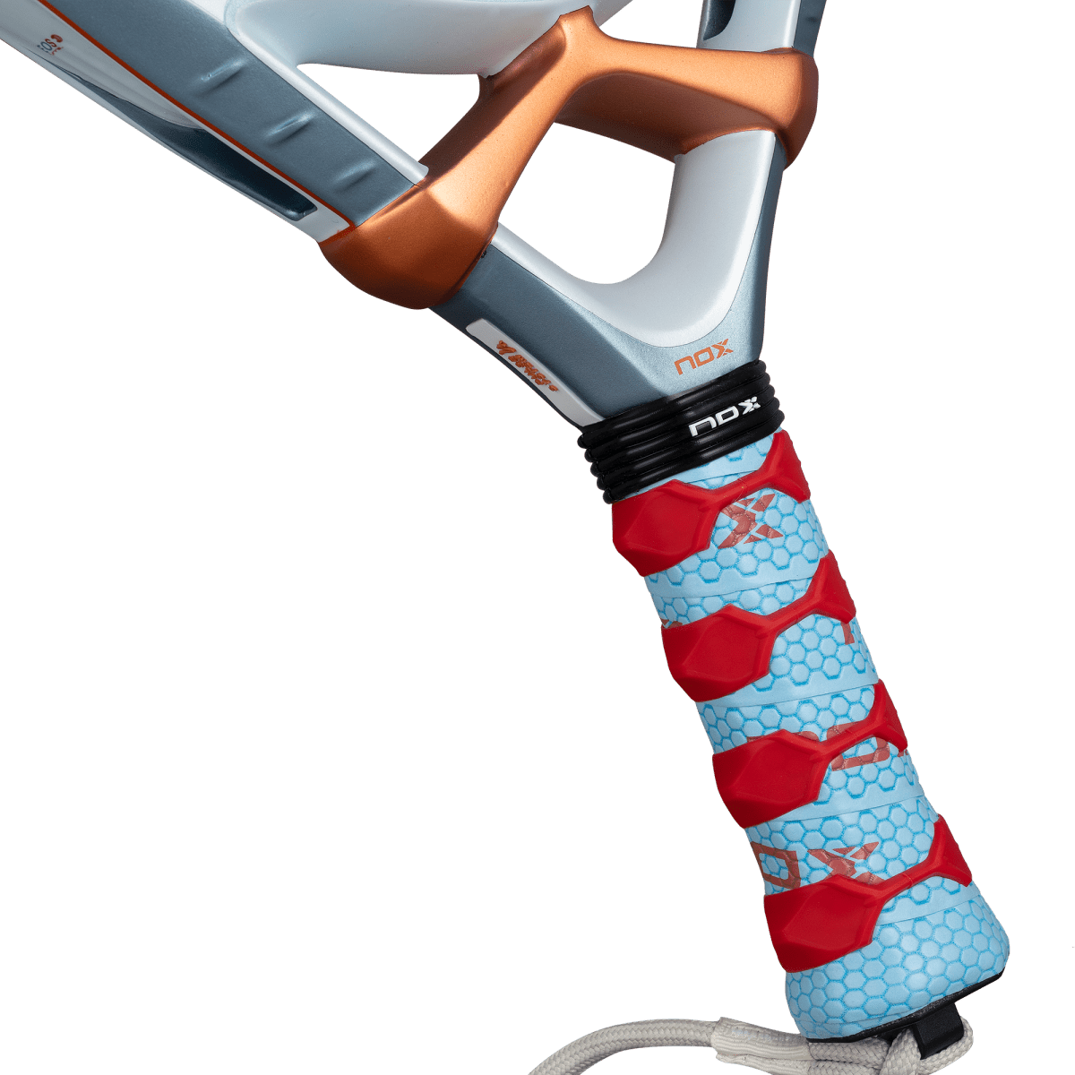 Tehnologie inovatoare care integrează sistemul patentat NOX Custom Grip®, certificat de Testea Padel, pentru a îmbunătăți aderența și a reduce vibrațiile.